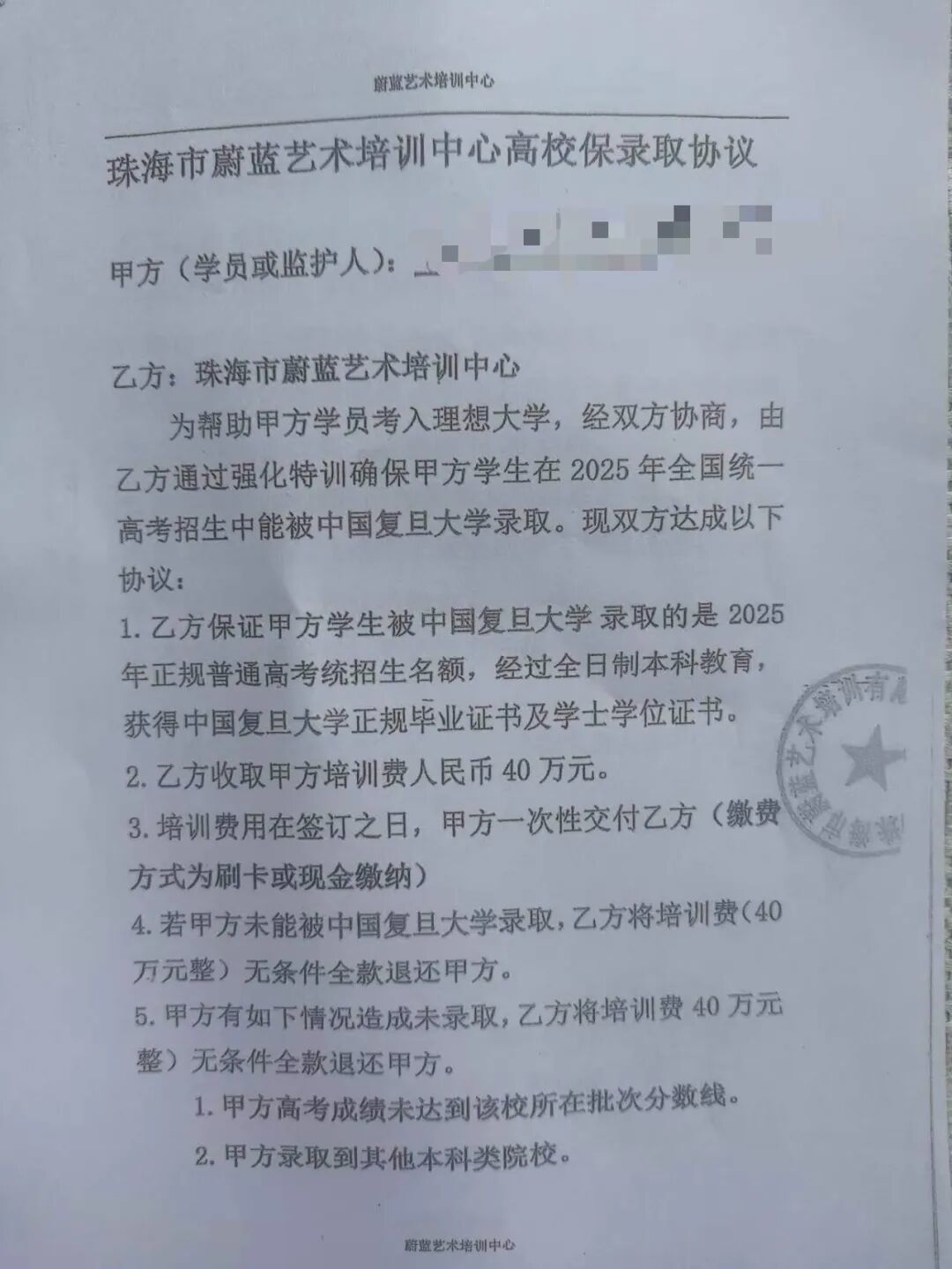 更生家长会上的先容。图片开端/受访者 据青鸟北附官方公众号信息,该校开设的传媒班属于艺术班畛域,系该校教学性格,由学校对学生艺术教学的轮廓评估恶果自觉选报。在多位家长的形色中,传媒班的文化课由校内教师讲课,专科课程由机构憨厚庄重讲课,教学处所包括校内及校外场合。 “其时李蔚和我说,会动用师资力量确保学生文化分和艺术分达标,获利不睬思的学生还能享受单独带领。” 另别称2025届家长张建向中国新闻周刊示意,恰是这份承诺,让他撤废了疑虑。 据林双回忆,升入高二后,李蔚又推出“高校保中式契约”,向班里学生提供暨南大学、深圳大学、上海戏剧学院等五所院校采纳,并宣称“每校仅2个限额,先到先得”。 林双的姆妈季女士向中国新闻周刊先容,为了一个深圳大学的“限额”,家里付了35万元。用度是在李蔚位于香洲区的机构交纳的。自后林双的文化分差了几分,李蔚又称不错补录到广州大学,之后又说不错被中式到澳门的一所大学,临了,林双被某有名高校的海外本科技俩中式,“本色上有钱就不错读,压根不看高考获利”。 临走还思骗一笔 中国新闻周刊了解到,林双那一届之后,上述指定高校的“保中式”花样仍在链接实行。 一位家长出示的《珠海市湛蓝艺术培训中心高校保中式契约》夸耀,为匡助甲方学员考入理思大学,经两边协商,由乙方(机构)通过强化特训确保甲方学生在2025年天下团结高考招生中能被中国复旦大学中式。培训费为40万元,要是未被中式,乙方承诺无条目退款。