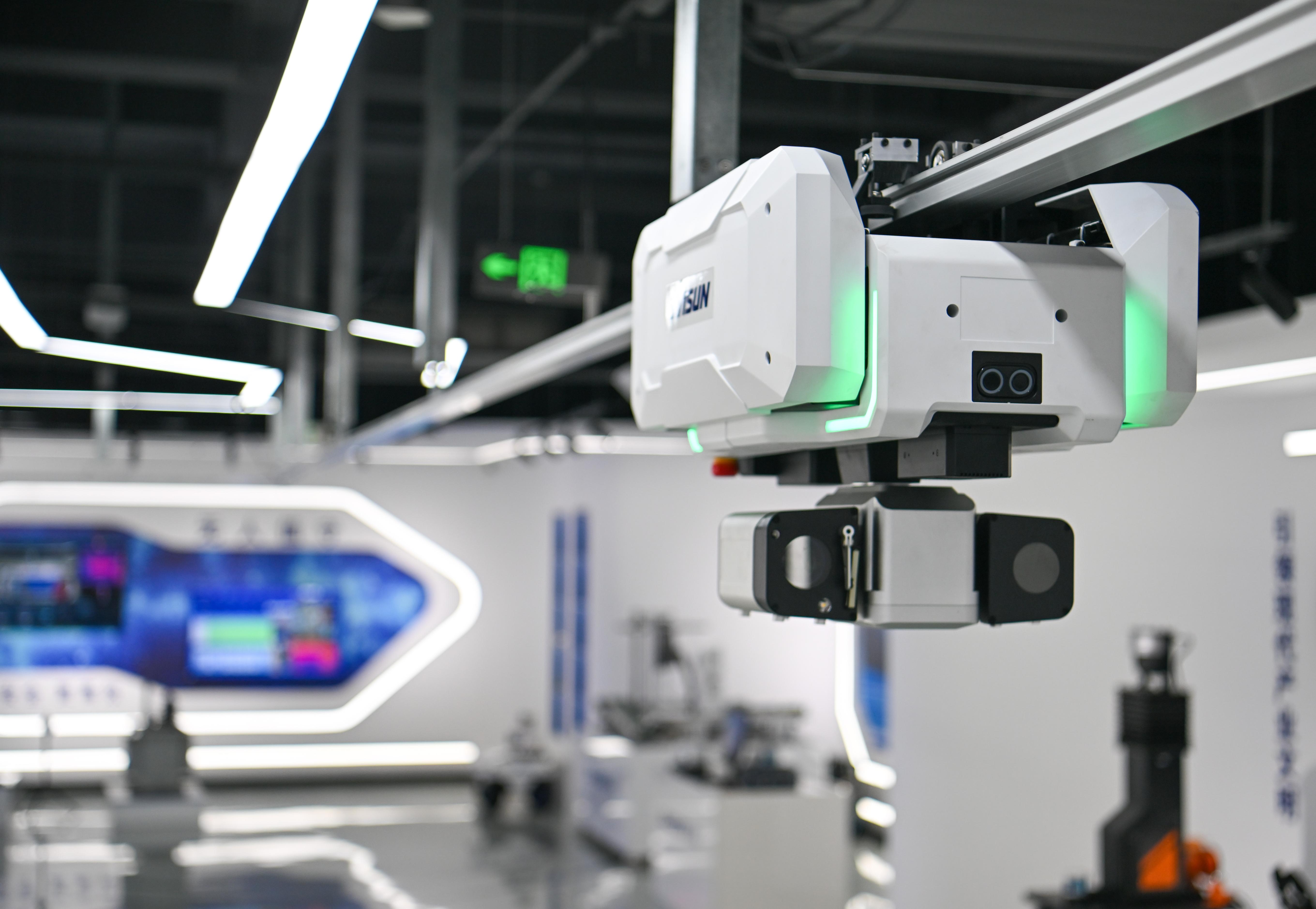 在位于京津中关村科技城的天津新松智能科技有限公司拍摄的一款轨谈式无东谈主值守机器东谈主(2月20日摄)。新华社记者孙凡越摄