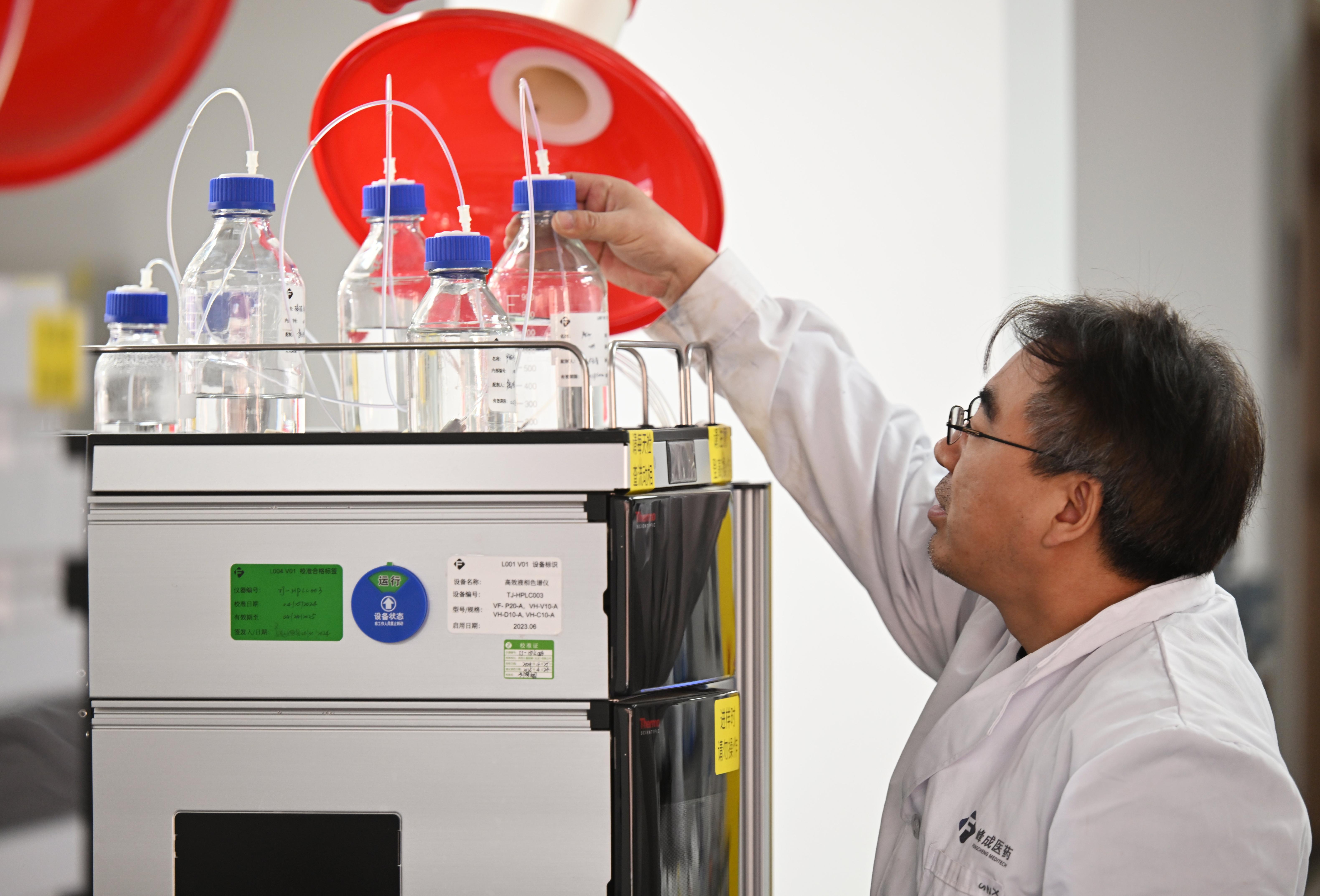 在位于天津滨海—中关村科技园的峰成医药科技(天津)有限公司,科研东谈主员在分析履行室内服务(2月20日摄)。新华社记者李然摄
