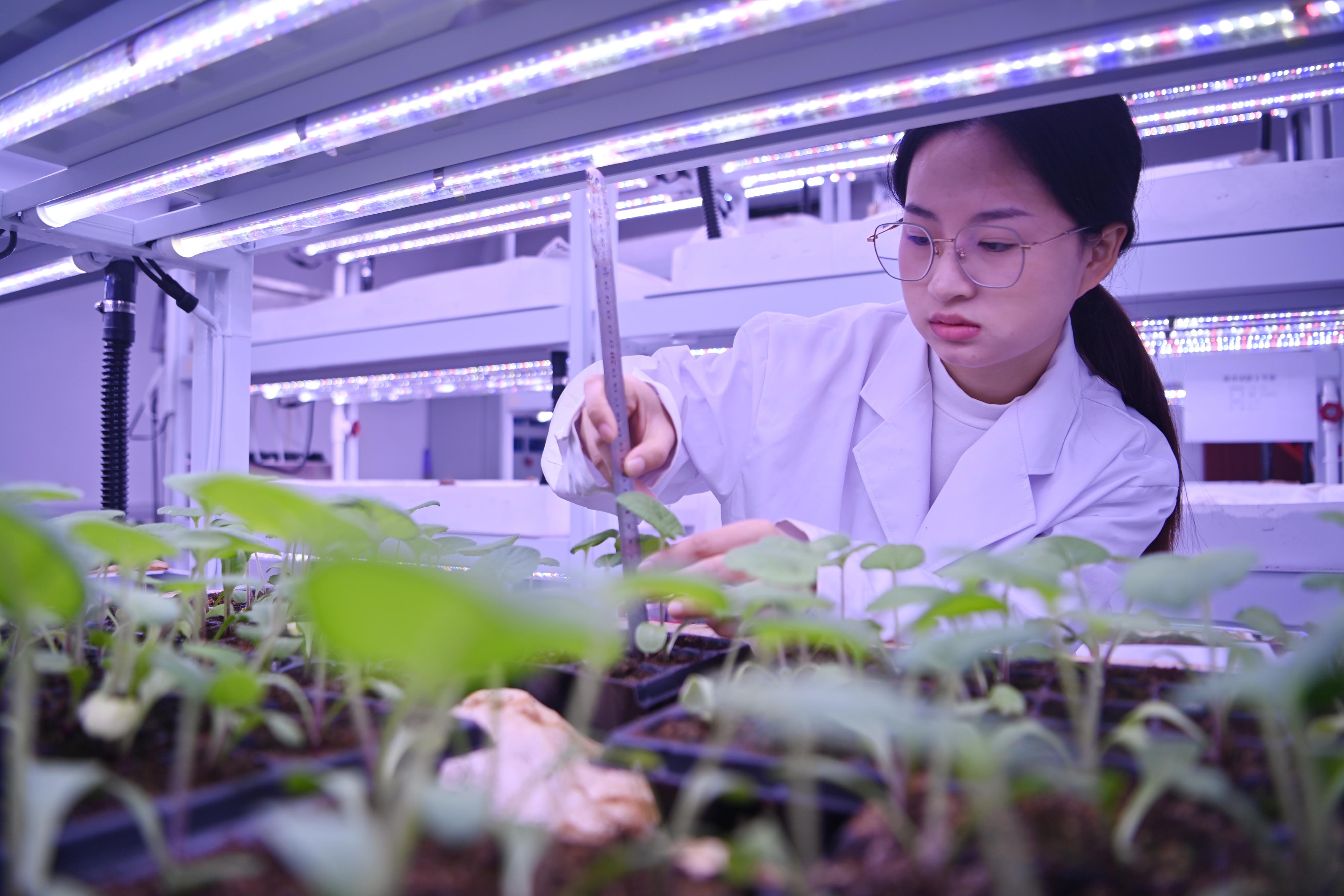 在位于天津滨海—中关村科技园的科芯(天津)生态农业科技有限公司,服务主谈主员在植物工场内测量滋长数据(2月20日摄)。新华社记者李然摄