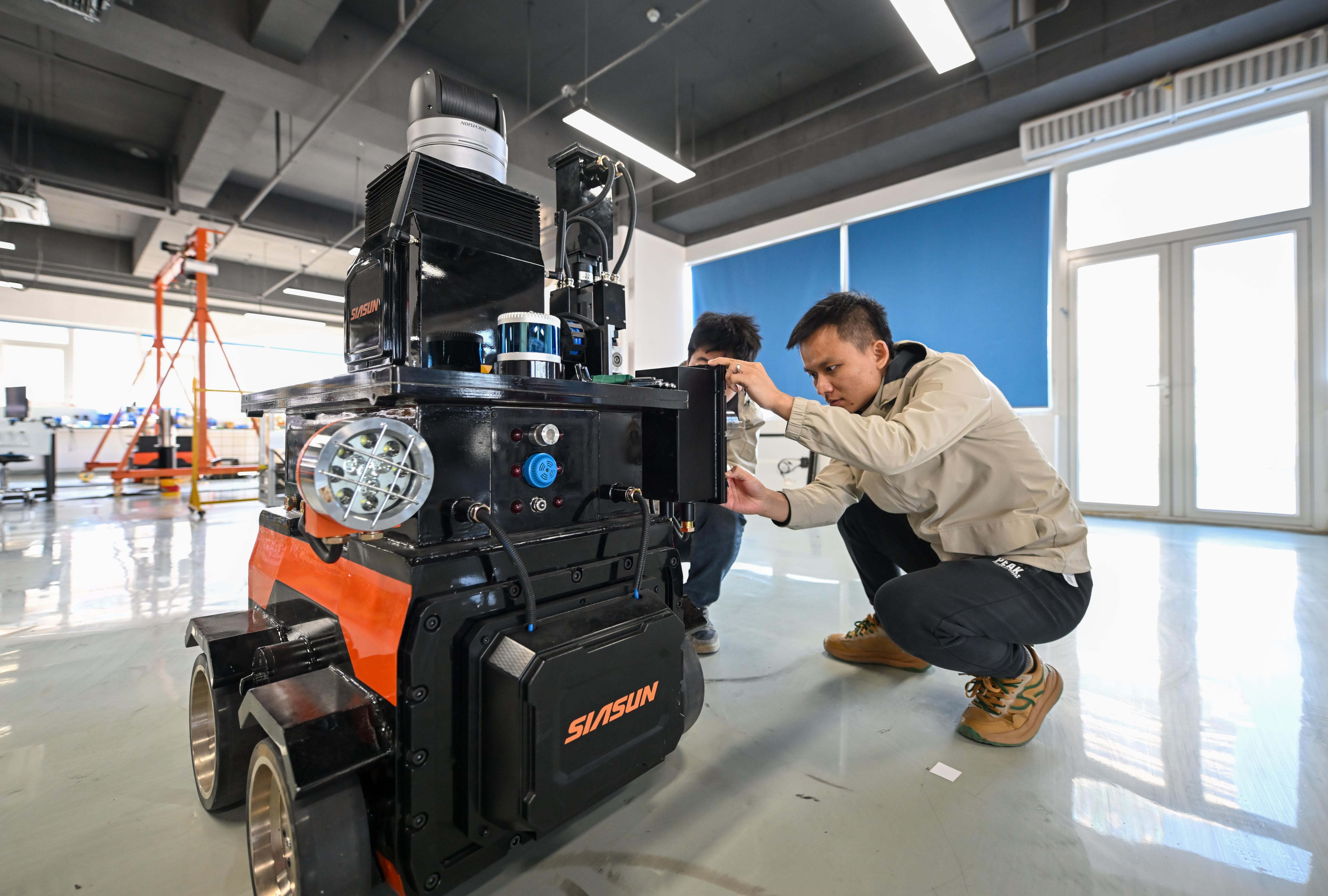 在位于京津中关村科技城的天津新松智能科技有限公司,工程师对一款矿井无东谈主巡缉机器东谈主进行调试(2月20日摄)。新华社记者孙凡越摄
