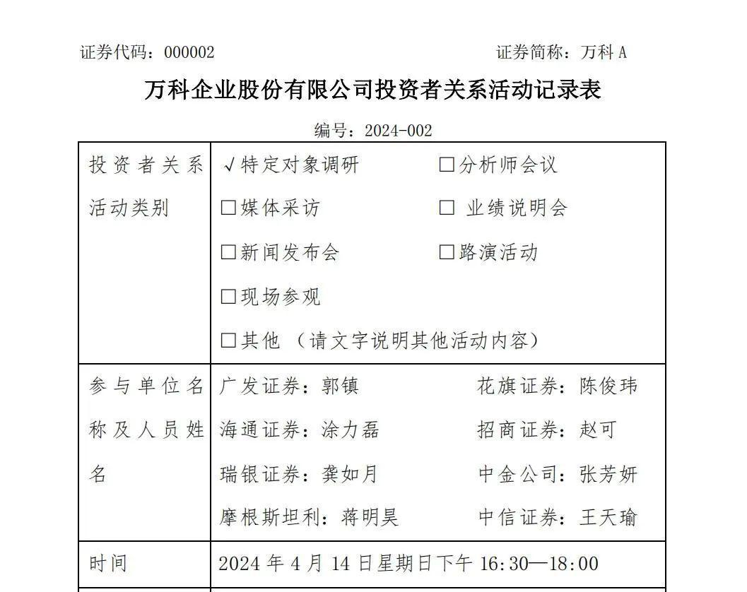 4月14日晚间,万科发布公告称当日接受了部分投资者的调研,公司董事会主席郁亮、总裁祝九胜、董事会文书朱旭参与理睬,并回答了调研机构提议的问题。
