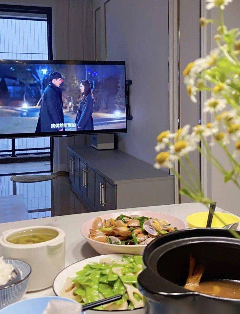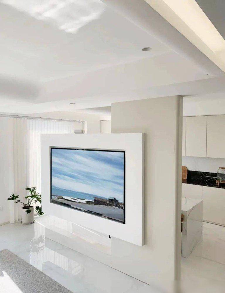 自后试着把电视挂在餐桌和沙发中间的墙上,哎可算处分了“吃饭追剧难”的问题:早上喝豆乳能看早间新闻,晚上全家吃外卖能一谈追综艺,角度刚好不良友;怕偶尔角度不合?装个旋转支架,思转哪边转哪边,洞开式厨房的话,炒着菜还能瞄两眼锅里的菜和电视里的剧情,比过去“作念饭只可听声”强多了。