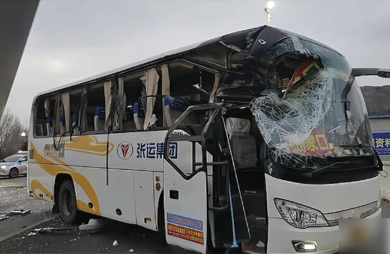 有网友发布的视频判辨,谈路上停着一辆损毁较为严重的大巴车,车身有“张运集团”联系标记。大巴车的车头受损较为严重,车身右侧车窗玻璃险些一谈缺失,车门处严重诬蔑变形。现场还停放着一辆运输风力发电桨叶的大货车,桨叶停留的位置与前述大巴车车顶相隔很近。