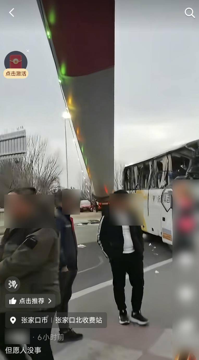 又名现场眼见者告诉极目新闻记者,事发地位于张家口北高速出口近邻,是一辆大巴车与一辆运输风力发电桨叶的大货车发生了碰撞,15日下昼5时许,他途经时看到大巴车上还有乘客,那时未见到受伤东谈主员。