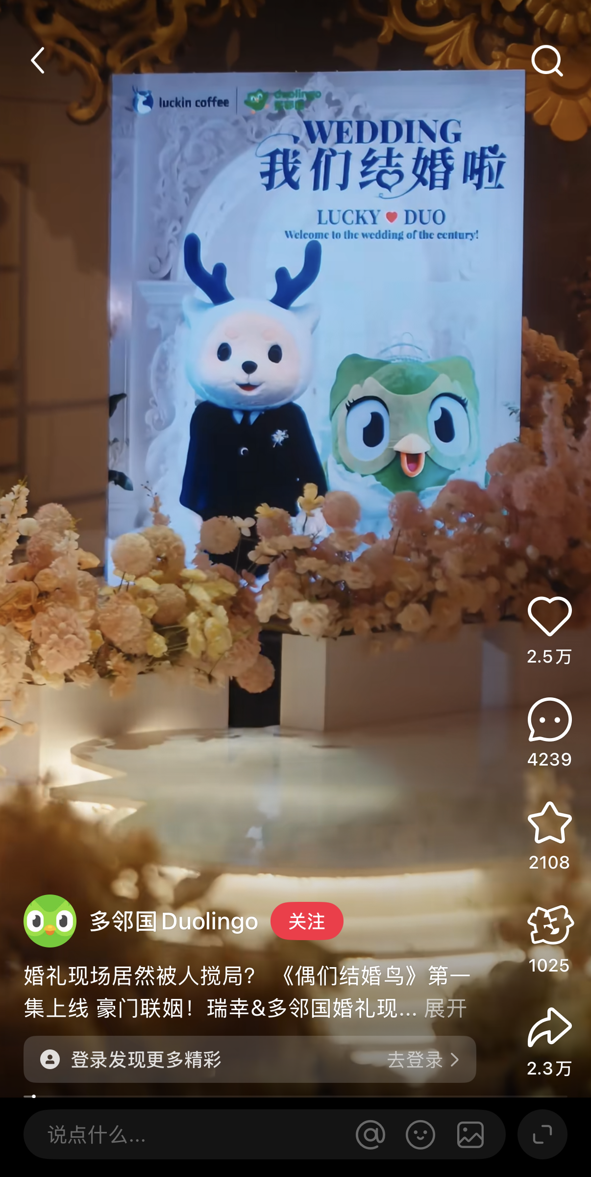 一只绿色的鸟穿上婚纱,和一头蓝白色的鹿“成亲”了,还拍了三集短剧——本年暑期,多数东说念主在小红书上刷到了这一系列吊足东说念主胃口的视频。它是话语学习平台多邻国(Duolingo)和连锁咖啡品牌瑞幸的联名营销🦄开云彩票(中国)官方网站,在很多网友看来,这种呈现方式概况显得过于“概括”,但关于多邻国,这仅仅其不拘一格的营销中的冰山一角。