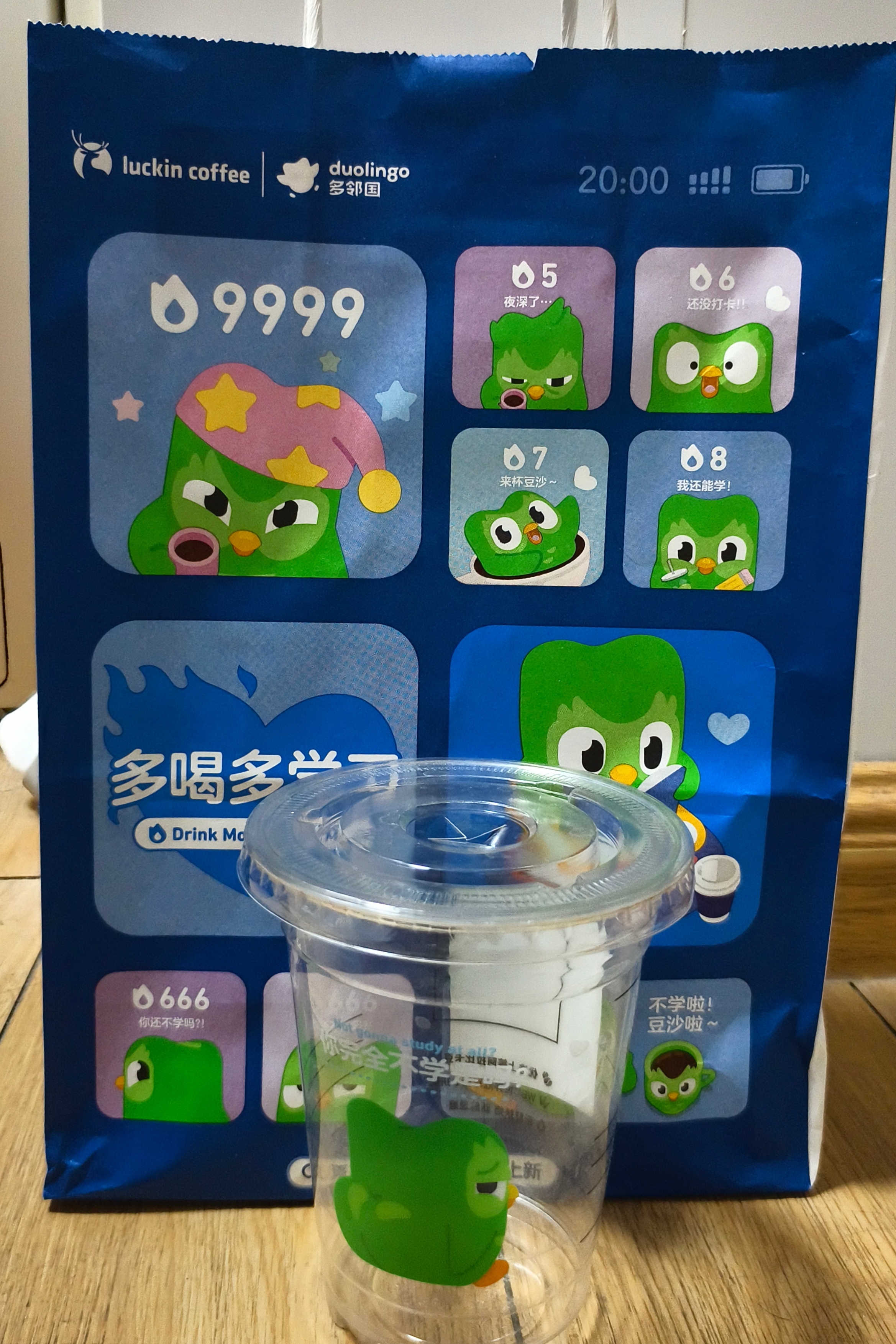 多邻国与瑞幸咖啡联名的包装袋和饮品杯(图/受访者)